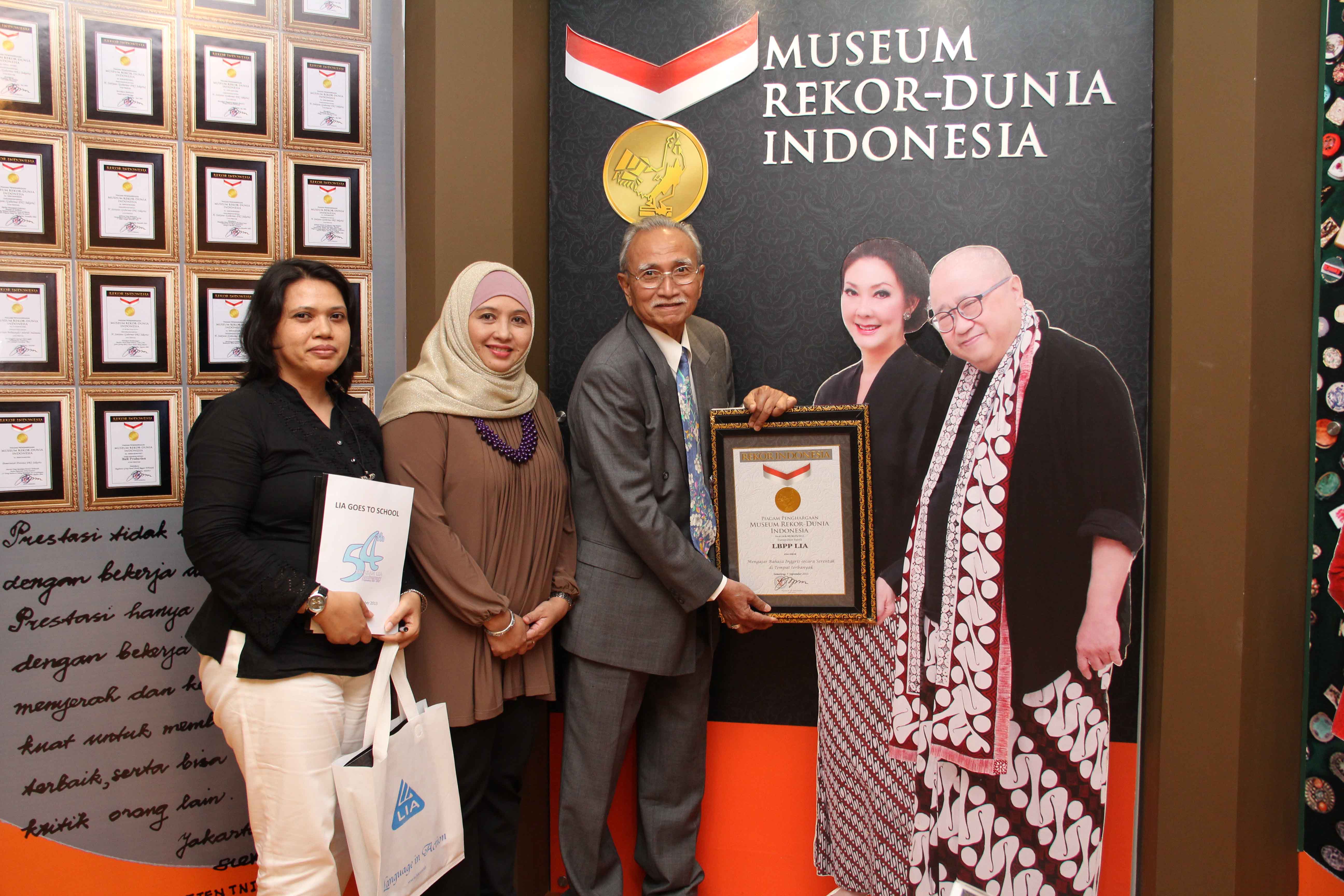 Penghargaan ini merupakan berkah tersendiri bagi LIA  yang berulangtahun di bulan September ini .  Pada 29 Agustus yang lalu LIA juga menerima penghargaan sebagai pemenang Word of Mouth Marketing dari Majalah Swa dan Lembaga riset onbee untuk kategori English Course.muri1LBPP LIA menerima penghargaan dari Museum MURI untuk Pembelajaran Secara Serentak dan Terbanyak  yang diadakan pada 5 September 2013 oleh 51 gerai LIA secara serempak ke 51 sekolah di seluruh pelosok Indonesia.